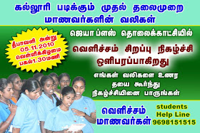 Pls See VELICHAM Special Program on JAYA PLUS on 1.30 pm Dewali. by STUDENTS HELP LINE 9698151515.Pls Frwd Your mobile Friends 4 Good Cause