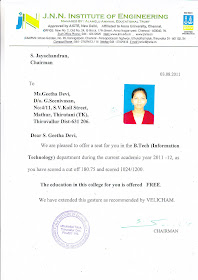 பார்த்த பெரியபாளையத்தில் உள்ள ஜே.என்.என் கல்லூரி கீதாதேவியை B.Tech பொறியியல் பட்டபடிப்பில் சேர்த்து கொள்வதாகவும் கீதாதேவியின் முழுகட்டணத்தையும் கல்லூரிநிர்வாகமும் ஏற்றுக்கொள்வதாகவும் உறுதியளித்து அதற்கான கடித்தை நம்மிடம் கொடுத்தார்கள்.. கடந்த ஒருவாரத்திற்கு முன் கீதாவை கல்லூரியில் சேர்த்தோம்..