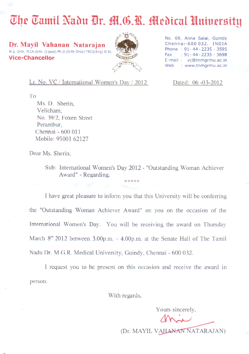 உலக மகளீர் தினத்தில் தமிழ்நாடு டாக்டர் எம்.ஜி.ஆர் மருத்துவ பல்கலைகழகத்தில் வெளிச்சம் அமைப்பின் தலைவர் வெளிச்சம் செரின் அவர்களுக்கு சிறந்த சமூக சேவைக்கான விருதை இன்று மாலை பெறுகிறார்.. அதற்கான கடிதத்தை தங்கள் பார்வைக்கு சமர்ப்பிக்கிறோம்.